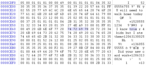 Let's say a bowl of Trix has been eaten, and you need to determine who did it and when. A keyword search for "trix" brings you to the following message in unallocated space (phone numbers have been changed for this example):